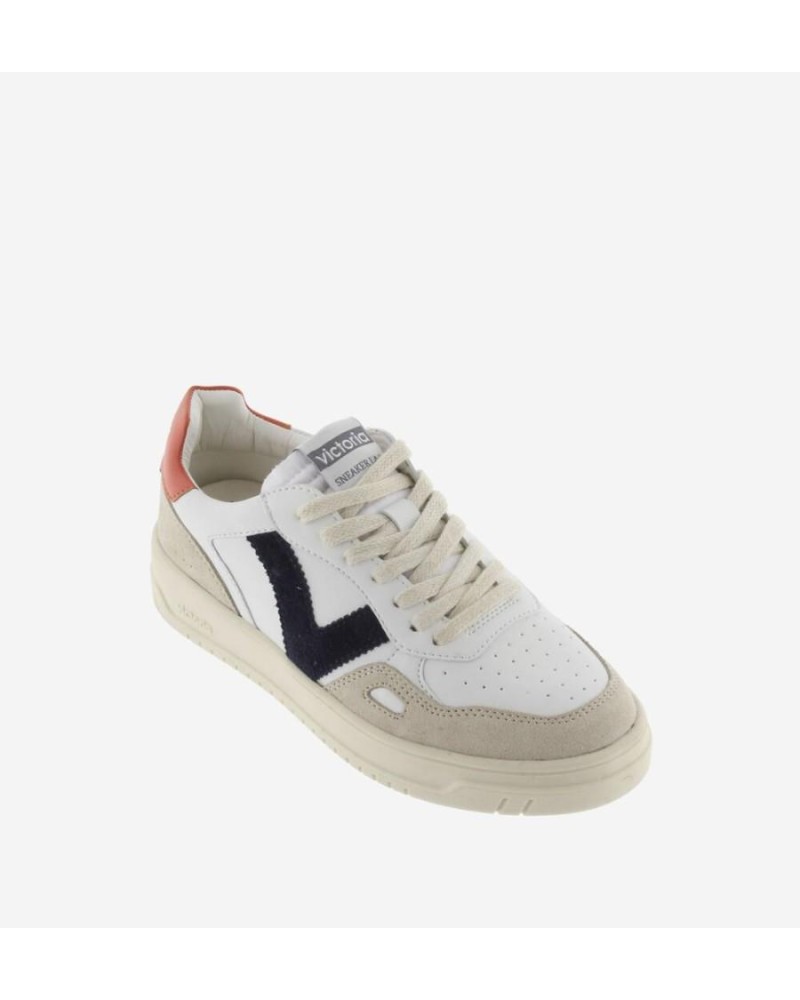 Zapatillas blancas para mujer y hombre fabricadas en material efecto piel y piezas en serraje en puntera, talón y V retro de victoria en negro. Toque de color naranja en la trasera y detalle en forma de ventana en el lateral. suela ligeramente tostada de 3,5 cm y cierre mediante cordones al tono. Incluye plantilla adicional acolchada para mayor confort.